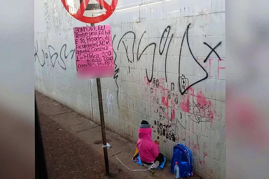 A cena de uma criança amarrada a uma placa de trânsito enquanto a mãe vendia pipoca no semáfaro chamou a atenção de motoristas e pedestres em Brasília (DF).