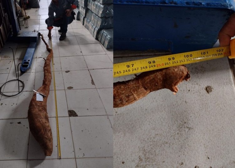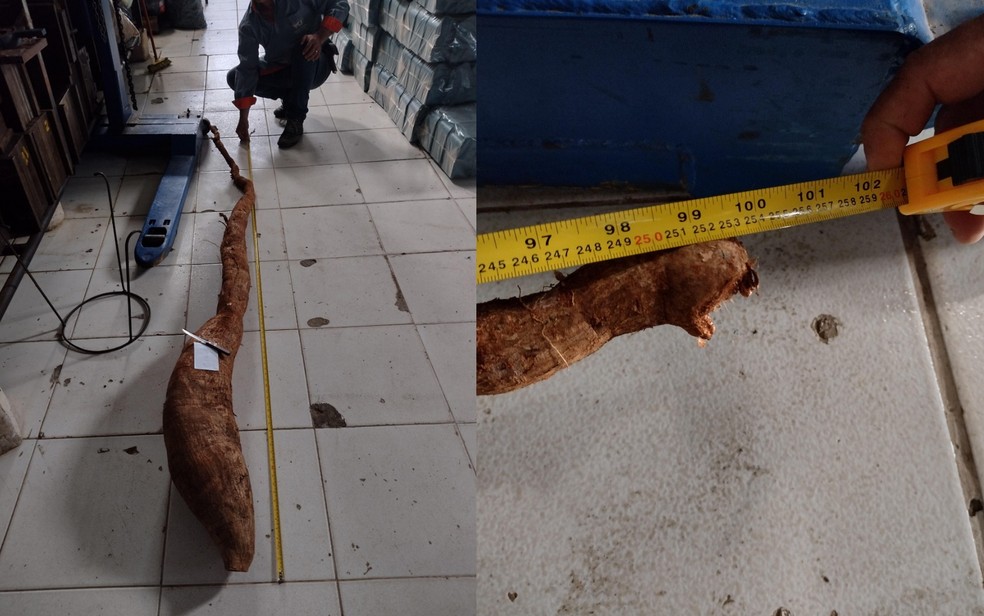 Um funcionário de uma empresa em Aparecida de Goiânia colheu uma mandioca de 2,53 metros enquanto realizava a limpeza de um lote na última 3ª feira (9).