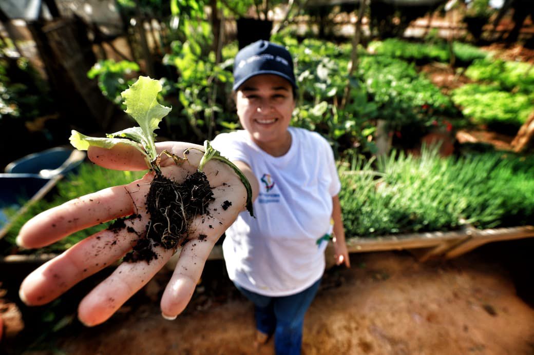 Nas mãos de Ihasminy Teixeira, uma muda de hortaliça representa mais que o início de uma plantação.