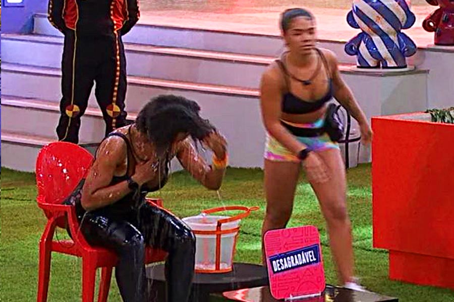 Fazia parte da brincadeira despejar água na cabeça de outro integrante. Porém, Maria exagerou na dose e acabou batendo o balde na cabeça da colega.
