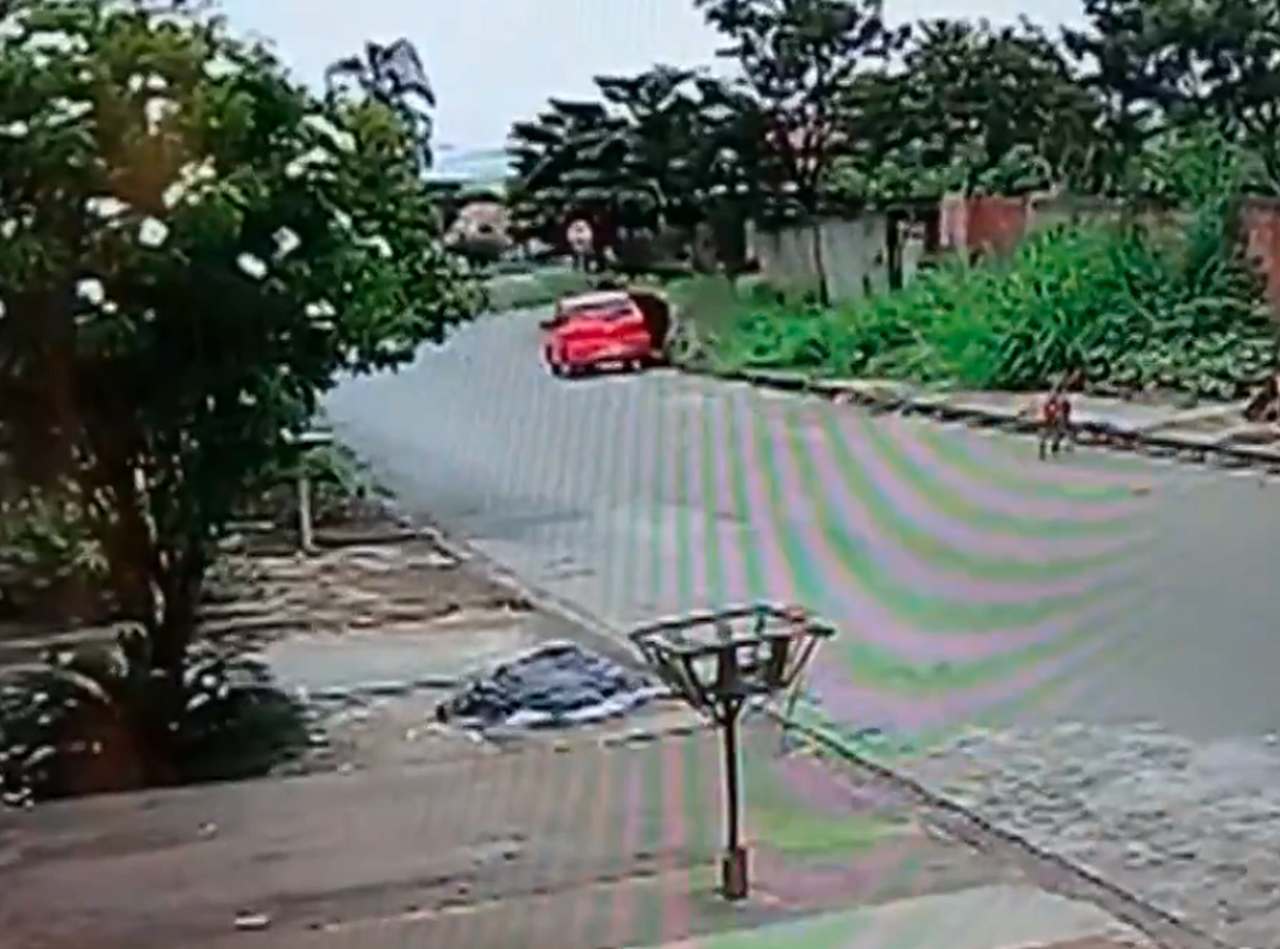 A câmera de vigilância de uma rua mostrou o momento em que a menina desceu desesperada do veículo.