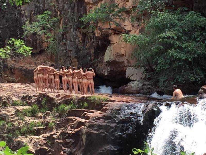 Na área onde foi feito o registro, a Catarata dos Couros, é permitido o nudismo. A foto em que todos mostram o bumbum foi compartilhada na última quarta-feira, 4, pelo ex-Malhação Rael Barja, em sua conta no Instagram.