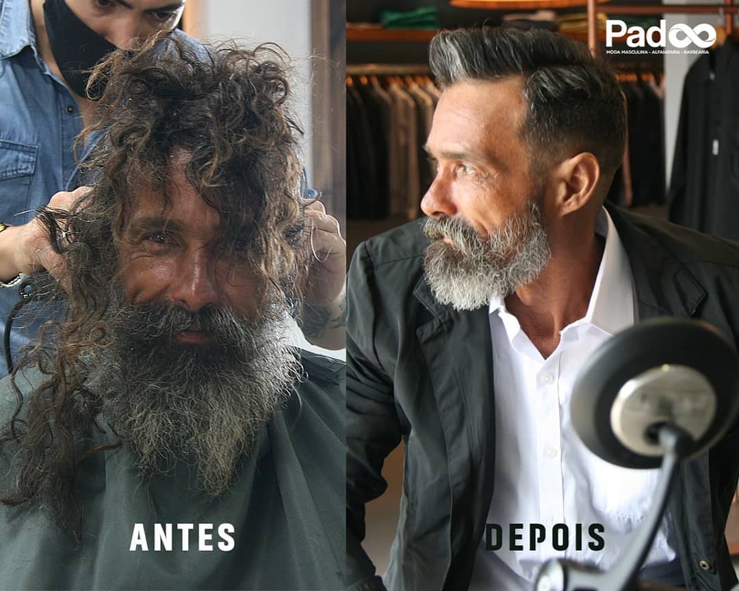 “Foi espontâneo. Ele passou na porta e estava muito barbudo. Pediu uma lâmina de barbear. Eu já conheço ele há uns 2 meses, sempre passa aqui. Então, surgiu a ideia de dar um banho de loja nele”, relatou.