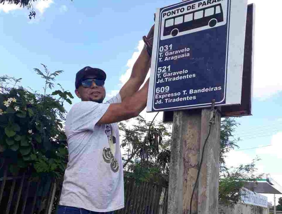 Neste caso, no Jardim Tiradentes, em Aparecida de Goiânia, moradores improvisaram uma placa para sinalizar o local do ponto de ônibus, tanto para os usuários quanto para o motorista.