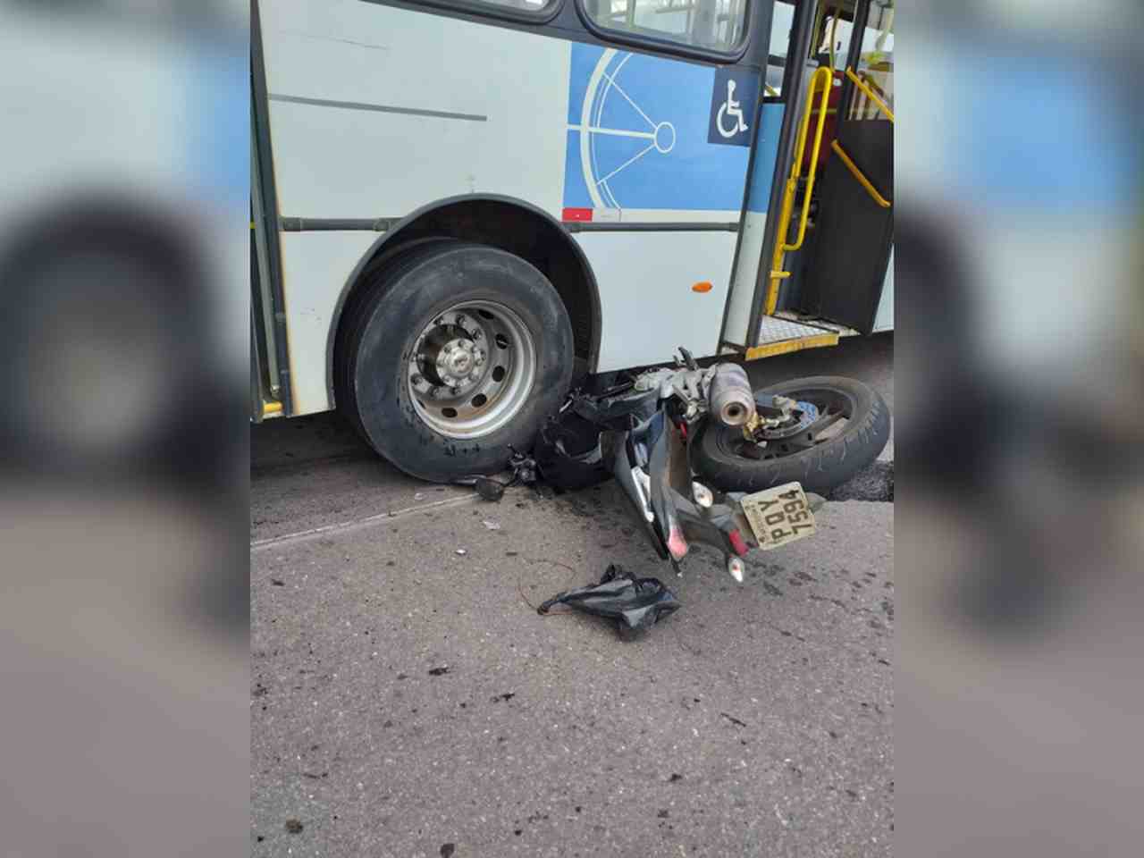 Já a motocicleta foi parar embaixo do ônibus e ficou bastante danificada.