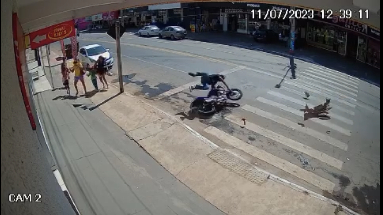 Motoqueiro e sua moto quase atingiram pedestres | Foto: Reprodução