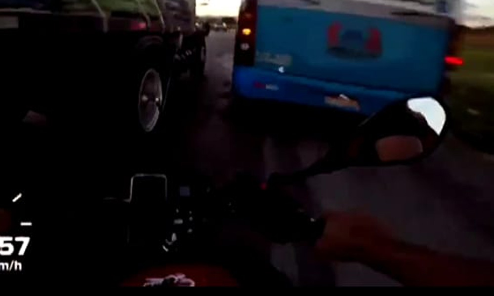 Um motociclista filmou o momento em que bateu na traseira de um ônibus durante um racha na GO-070.