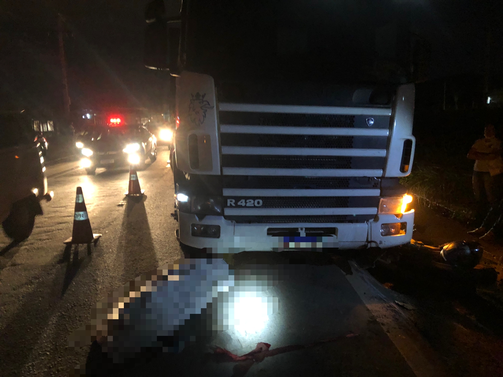 O motorista do carro contou que ultrapassava a carreta pela faixa da direita e não viu a moto.