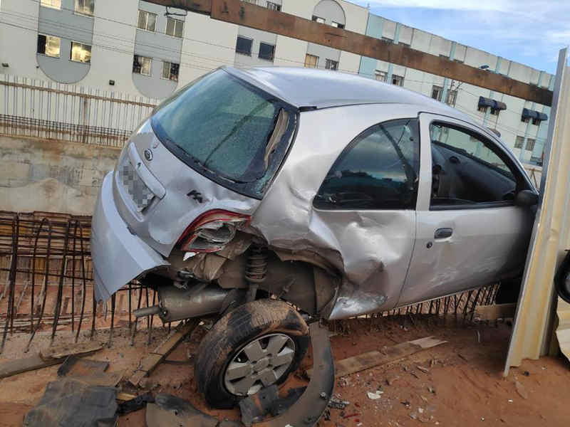Um carro ficou pendurado em uma trincheira em construção após acidente na Avenida São Paulo, na Vila Brasília, em Aparecida de Goiânia.