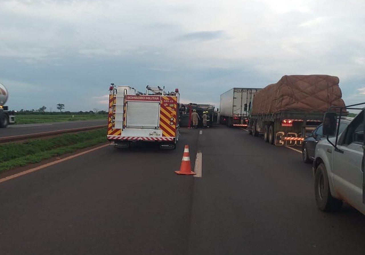 O caminhão estava tombado e atravessado na pista, bloqueando o trânsito do trecho.
