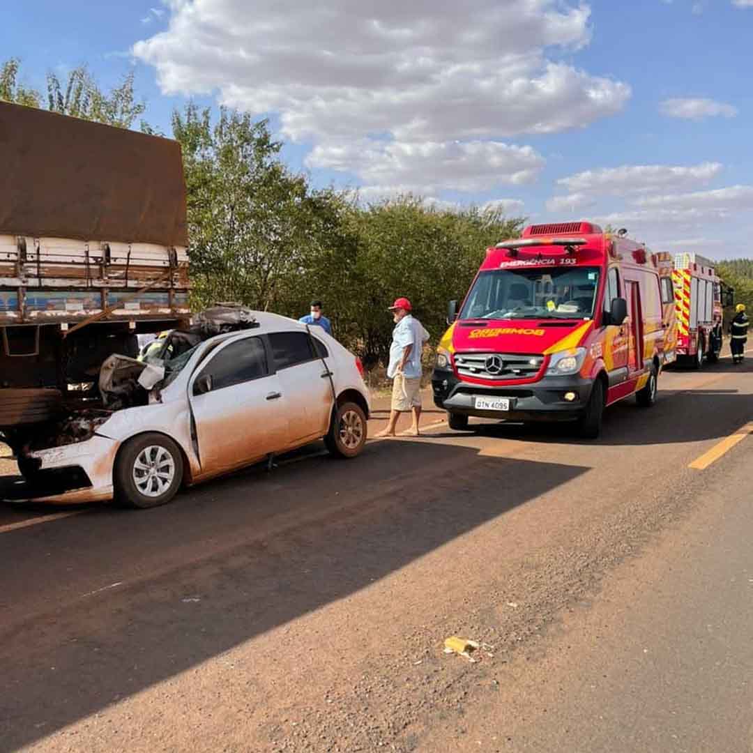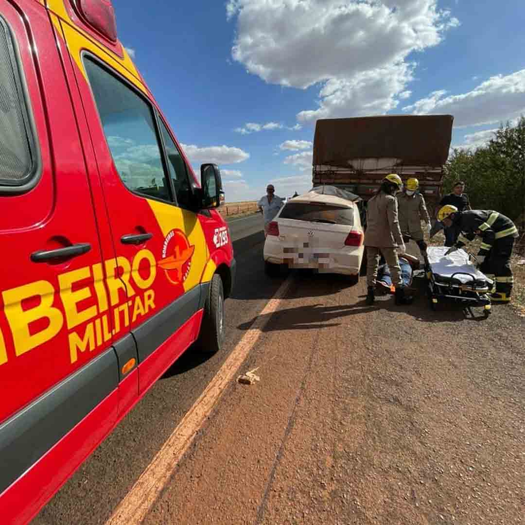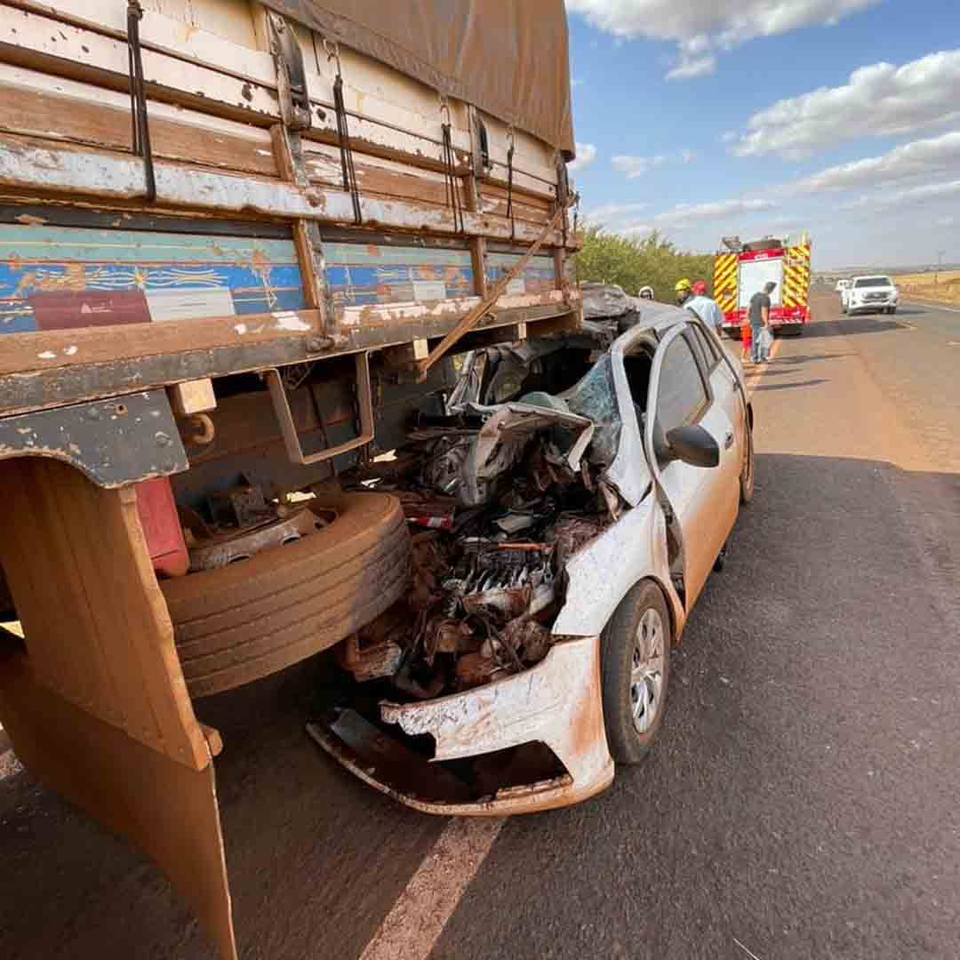 Na tarde desta 2ª feira (9), um veículo de passeio entrou na traseira de um caminhão na rodovia GO-210.