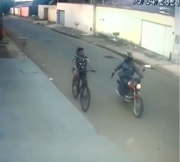 Na imagem, é possível ver o momento em que uma mulher em uma bicicleta é seguida e abordada por um motociclista, que mostra a arma e dá voz de assalto.