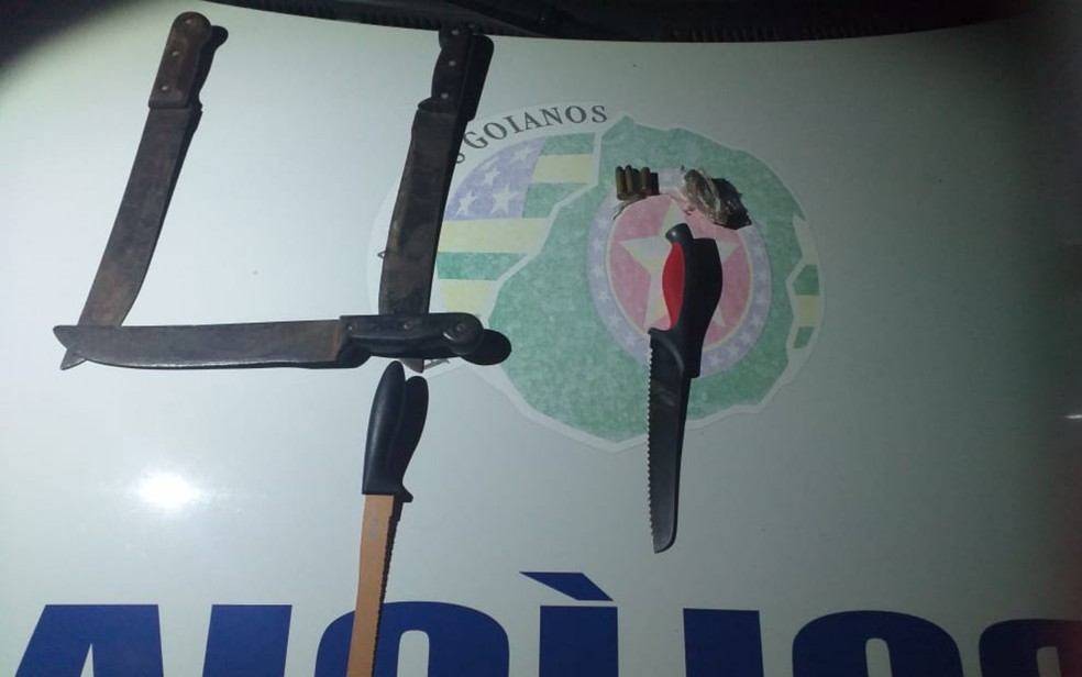 Em um quarto, os policiais encontraram duas munições, porções de maconha, 3 facões e duas facas grandes.