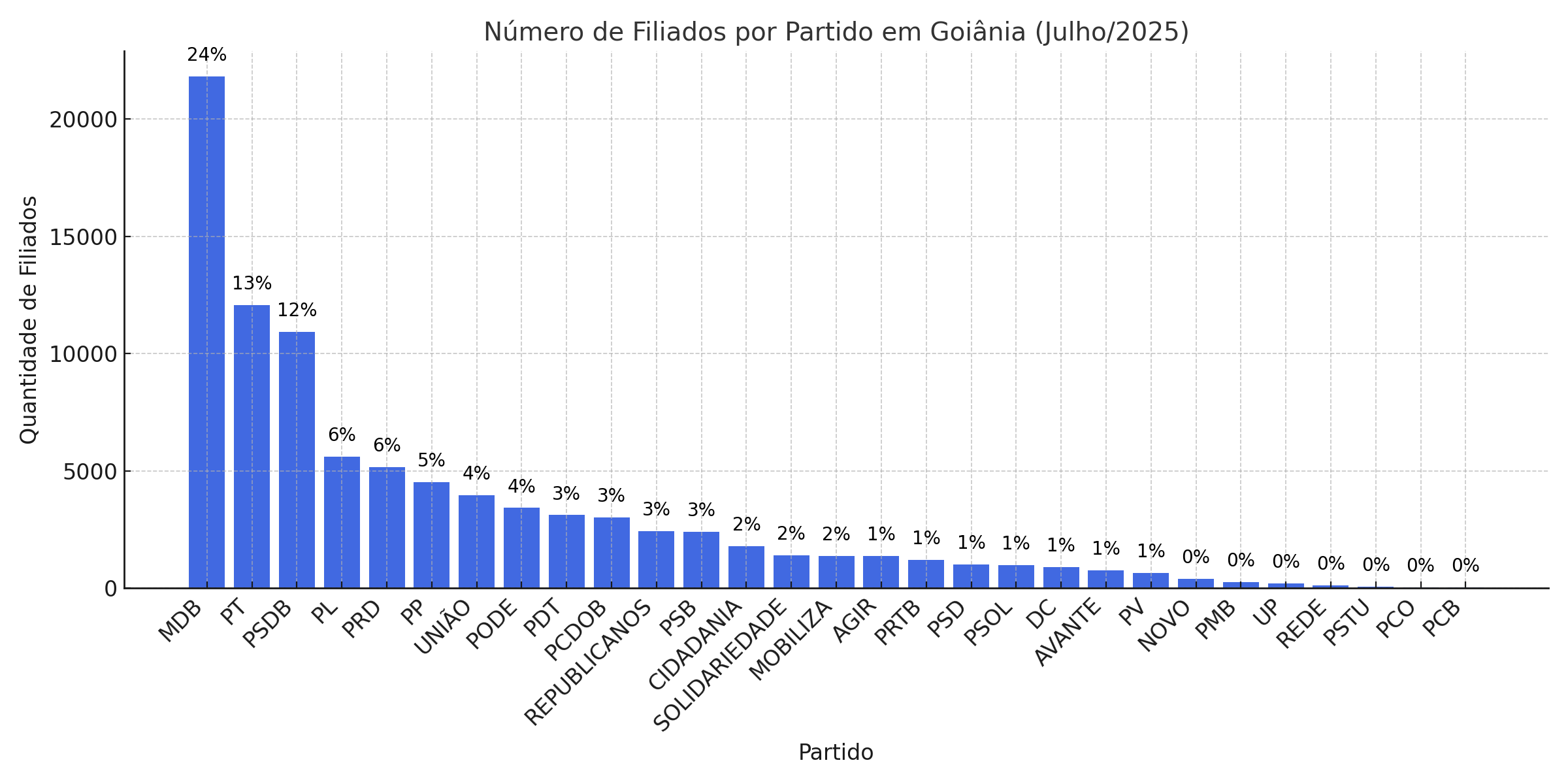 - Os dados indicam que o MDB mantém presença significativa em Goiânia, enquanto partidos como PT, PSDB e PL registram movimentações na base às vésperas das articulações para as eleições de 2026.