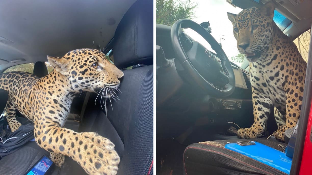 Durante as buscas, a onça foi encontrada brincando como um gato gigante dentro do carro do cinegrafista.