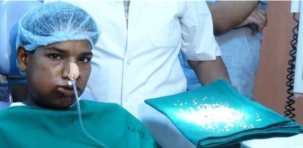 Um garoto indiano foi ao hospital por causa de uma dor na mandíbula direita e foi levado para a sala de cirurgia. Depois de sete horas de operação, os médicos acabaram removendo 232 dentes da boca do rapaz. De acordo com a família, o jovem sofria há 18 meses com uma constante dor no rosto.