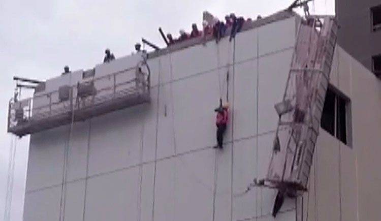 Um operário ficou pendurado no alto de um prédio na Avenida T-9, no Setor Bueno, nesta terça-feira (1º), após um incidente com um andaime.
