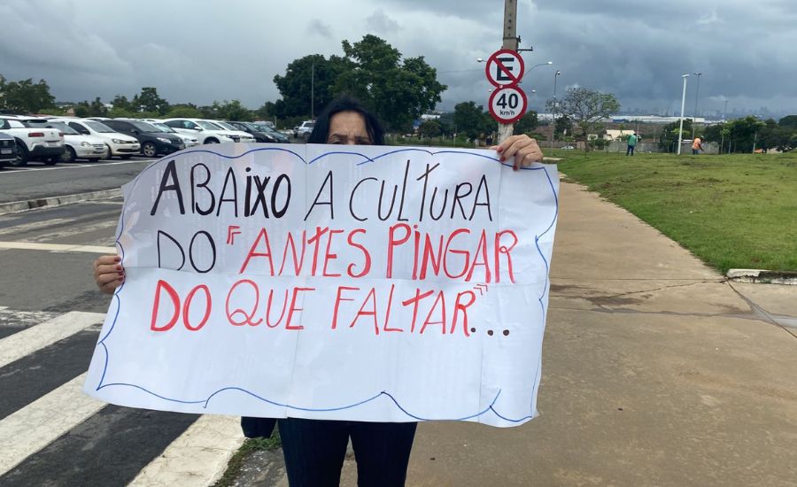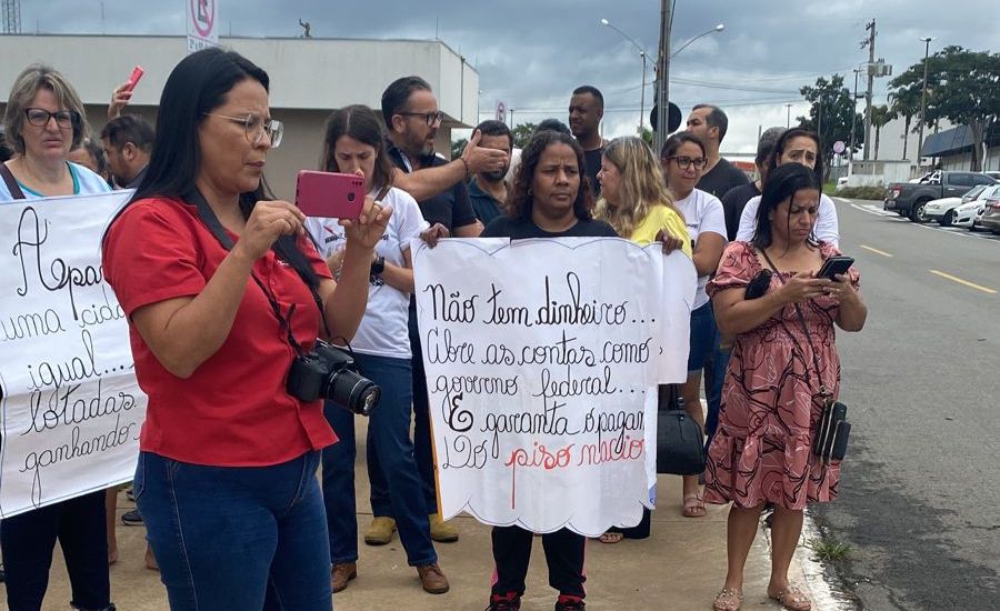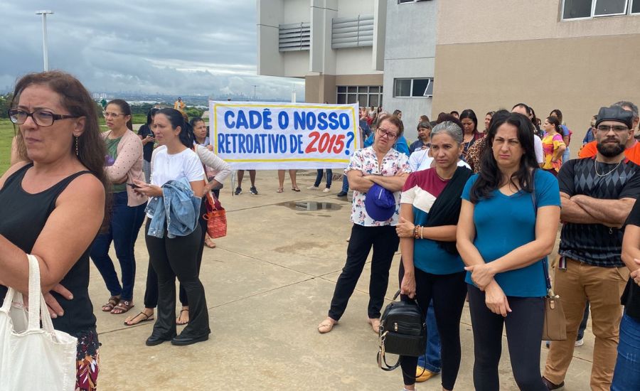 Um grupo de professores e funcionários administrativos da Educação voltou a paralisar suas atividades e protestar na frente da Prefeitura de Aparecida de Goiânia nesta 5ª feira (16).