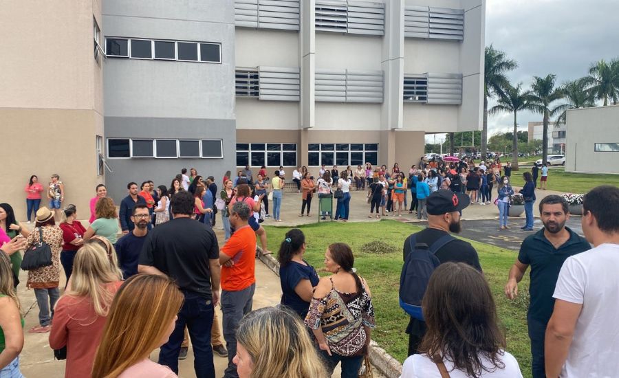 Um grupo de professores e funcionários administrativos da Educação voltou a paralisar suas atividades e protestar na frente da Prefeitura de Aparecida de Goiânia nesta 5ª feira (16).