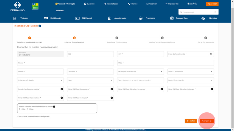 O candidato deverá clicar na aba CNH Social, avançar, escolher a categoria que pretende concorrer e avançar, informando os dados.
