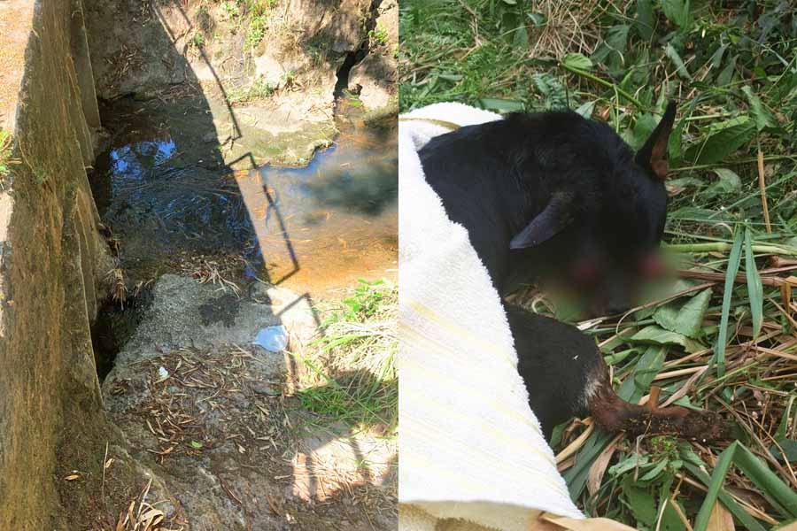 Pessoas que passavam pelo local viram o cão tentando sair do córrego e um indivíduo não identificado o resgatou, oportunidade em que viram que o animal estava com os olhos para fora da órbita ocular.