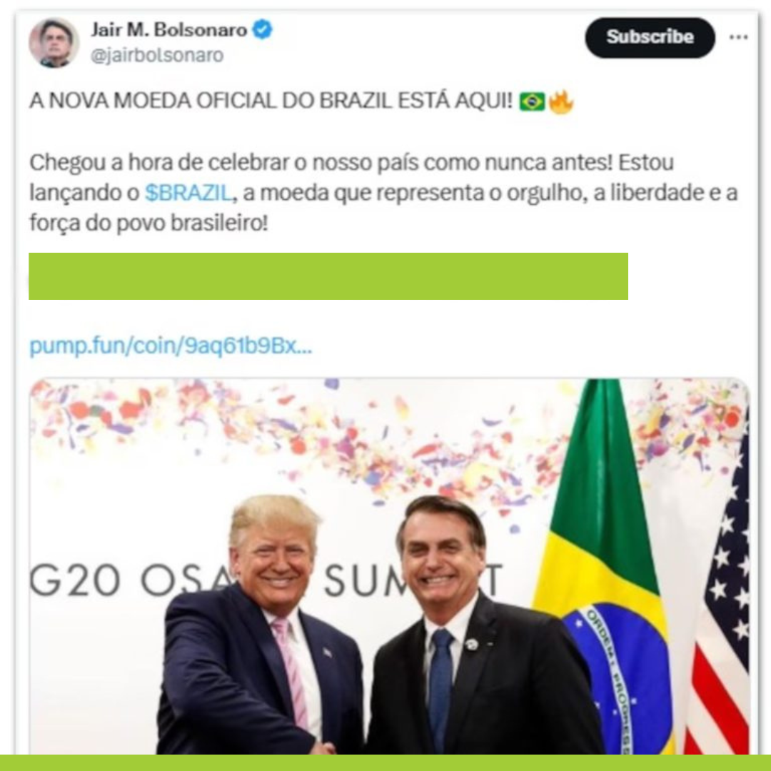 Uma das publicações era acompanhada de uma foto do ex-presidente com o mandatário dos Estados Unidos, Donald Trump, que lançou sua própria criptomoeda, a $TRUMP.