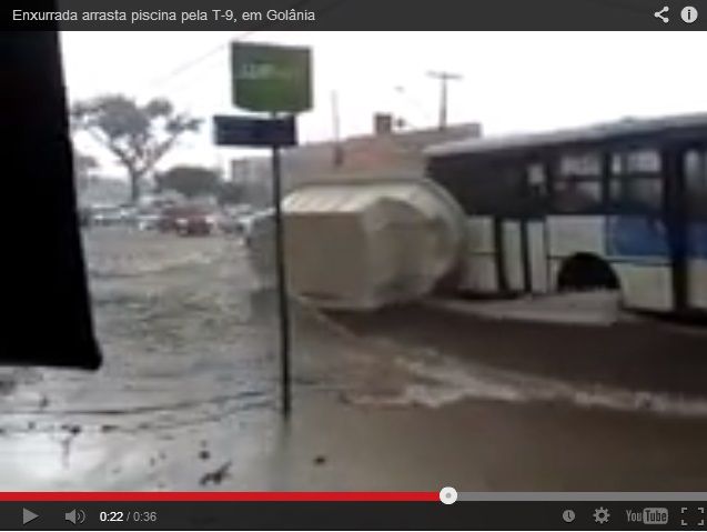 A forte chuva de ontem a tarde, 12, provocou muitos estragos em Goiânia e uma cena inusitada. O internauta Lunno Fernandes registrou uma piscina sendo arrastada pela enxurrada na Avenida T-9. Veja: