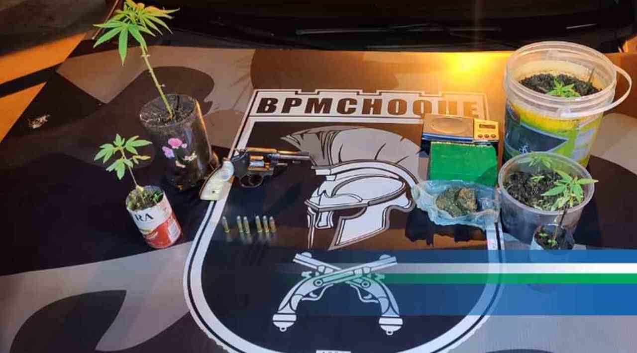 A polícia apreendeu cerca de 300 g de maconha embalada, 5 pés de maconha, uma balança de precisão, além do revólver calibre 32.