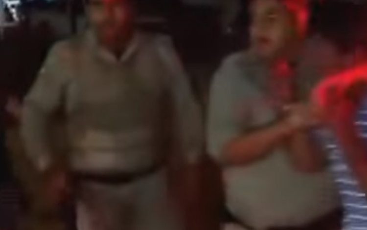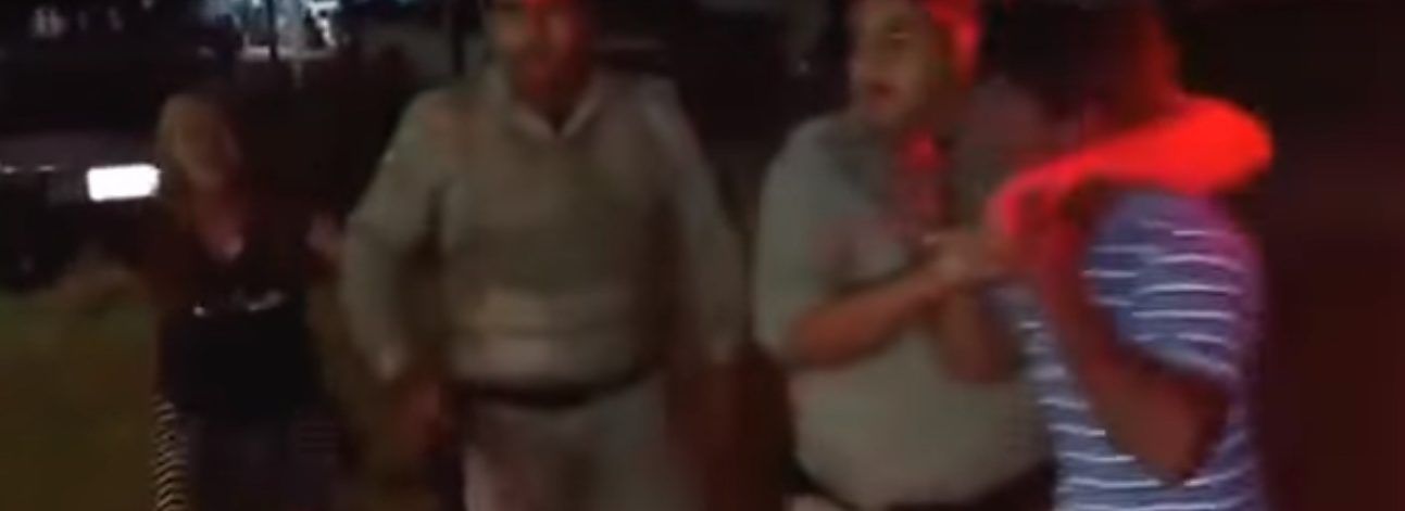 No vídeo, os policiais aparecem tentando prender um homem de camiseta azul listrada. Uma mulher tenta impedir a ação, gritando que ele não tinha feito nada que justificasse ser preso.