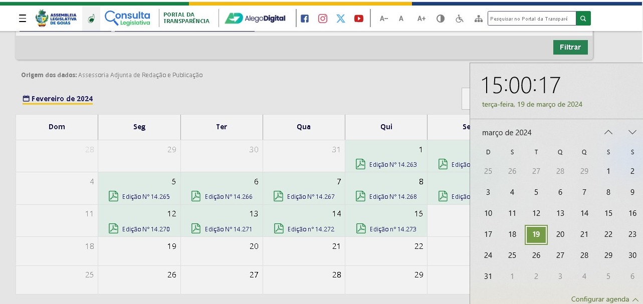 O Diário Oficial da Assembleia Legislativa de Goiás (Alego) completou 32 dias sem atualização, nesta 3ª feira (19).