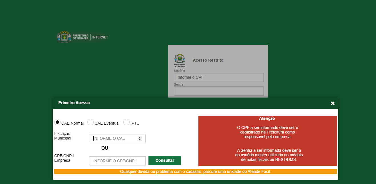 Para credenciamento, basta que o cidadão acesse o site oficial da Prefeitura de Goiânia, clique em Portal do Contribuinte e no botão Primeiro Acesso. Depois, basta preencher o formulário.
