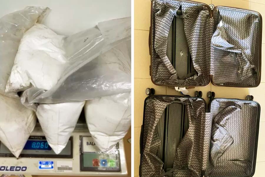 De acordo com a Receita Federal, foram apreendidos 8 kg de entorpecentes ilícitos, avaliados em mais de R$ 2 milhões, em um fundo falso de 2 malas.