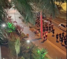 Nele, a 9ª Companhia de Alunos da Academia da Polícia Militar saúda o promotor em frente a seu apartamento, em Goiânia.
