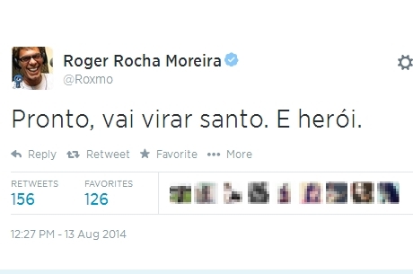 E mais uma vez o vocalista do Ultraje a Rigor, Roger Rocha, causou polêmica no Twitter. Na última quarta-feira, 13, o músico postou no microblog uma mensagem ácida após o anúncio da morte de Eduardo Campos: “Pronto, vai virar santo. E herói”.
