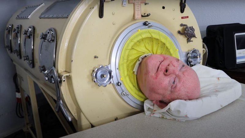 De acordo com médicos especialistas, o pulmão de ferro funciona como um enorme cilindro metálico, onde a pessoa se insere e fica apenas com a cabeça de fora.