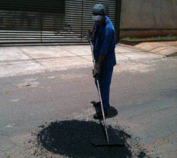Funcionário realiza operação tapa-buraco, em Goiânia