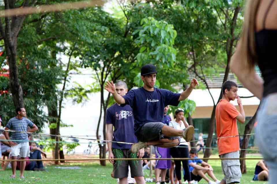 Em Aparecida não é diferente. Cada vez mais, esse lugares se tornam palco frequente da prática de um esporte diferente: o slackline.