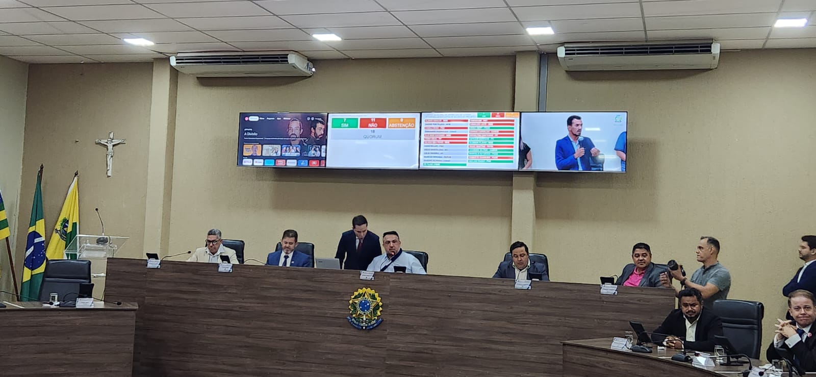 Uma das TVs do plenário da Câmara Municipal de Aparecida de Goiânia exibiu imagens de streaming de vídeos durante realização de Sessão Extraordinária, na manhã desta 4ª feira (1).