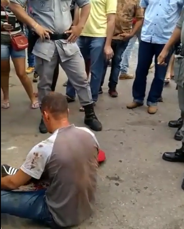 Nas imagens, é possível notar um aglomerado de pessoas em volta do homem, que aparece sentando e bastante ensanguentado.