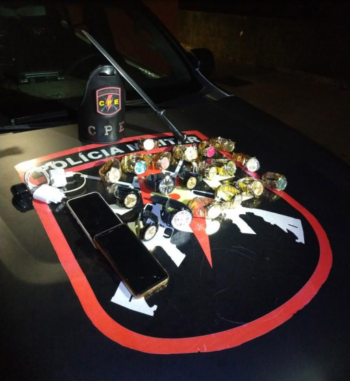 Durante a abordagem, os policiais encontraram vários objetos, como relógios, aparelhos celulares e carregadores roubados.