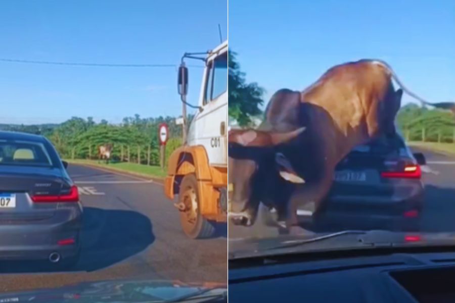 Um touro, aparentemente desorientado, foi flagrado avançando contra um homem e pulando sobre um carro de luxo.