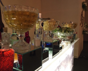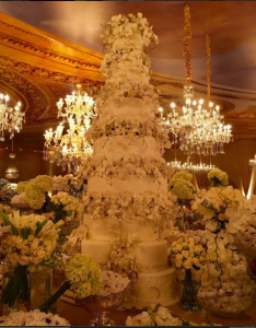 Lá, havia uma mesa de cristal e um bolo de 2,5 m ornamentado também de orquídeas, mas essas eram feitas de açúcar.