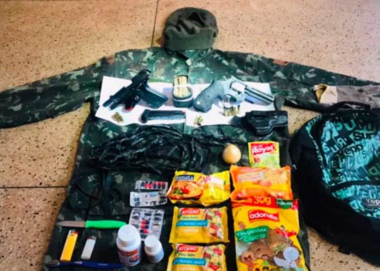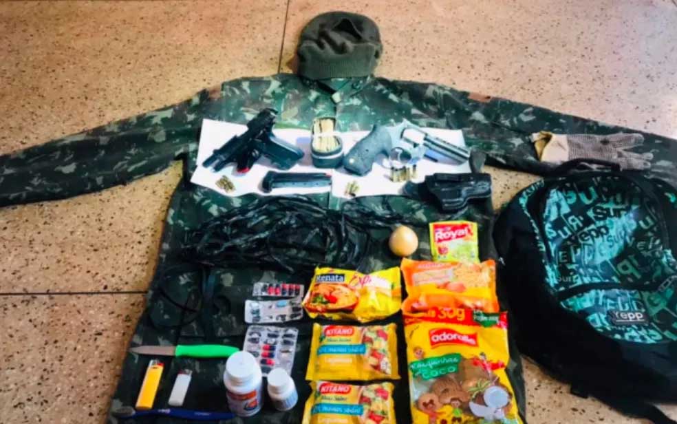 Nela, policiais encontraram 1 pistola; 1 revólver calibre 38; carregador de pistola; isqueiro; R$4, 4 mil em dinheiro; gandola camuflada; balaclava; luva de pano; frasco branco com óleo; vidro branco com amoxicilina; macarrão instantâneo; tempero pronto; cebola; biscoito; faca.