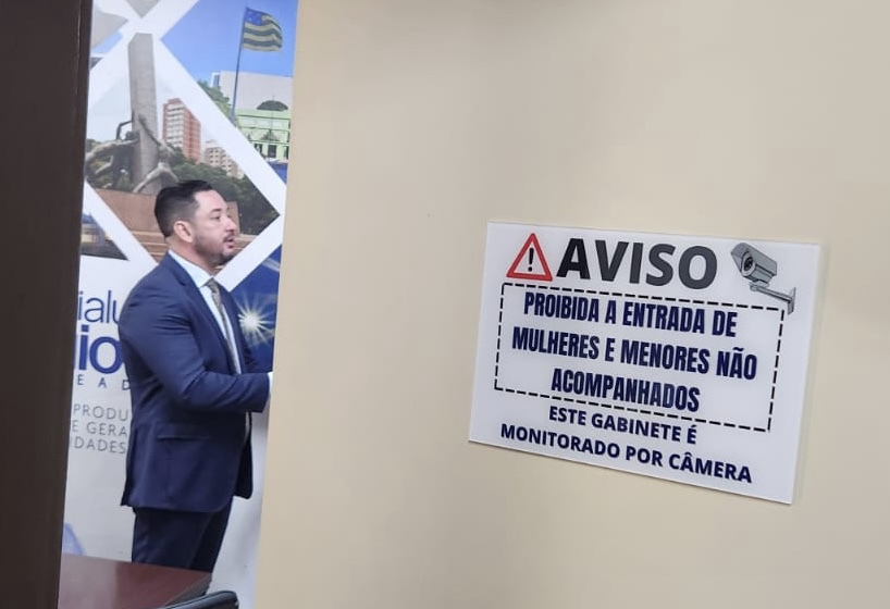 Na porta do gabinete do vereador por Goiânia e presidente estadual do Avante, Thialu Guiotti, uma placa sinaliza que mulheres e adolescentes não acompanhados estão proibidos de entrarem.