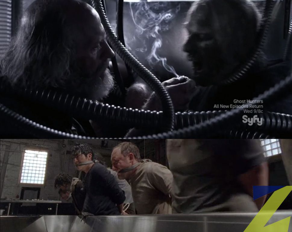 Enquanto isso, o S01E04 de “Z Nation” gerou um dos momentos mais cômicos dos ano. Doc, personagem interpretado pelo bom Russell Hodgkinson, é jogado num duto de ar e acaba enrolado em fios e preso frente a frente com um zumbi em decomposição. Vendo-se em situação tão desoladora, Doc faz a única coisa que lhe restava: acende seu último cigarro de maconha.
