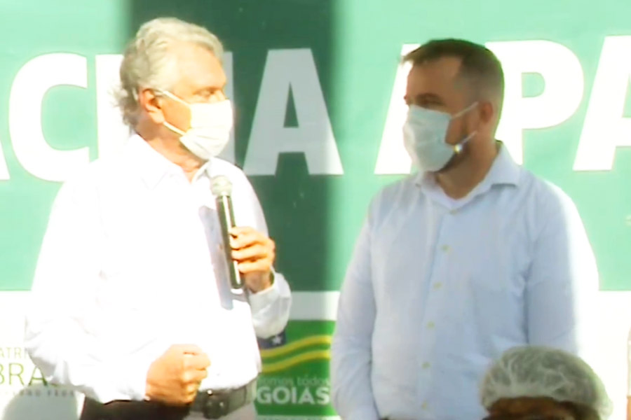 Ronaldo Caiado e Gustavo Mendanha durante cerimônia que deu pontapé inicial da vacinação contra covid-19 em Aparecida de Goiânia na manhã desta 4ª feira (20) | Foto: Reprodução