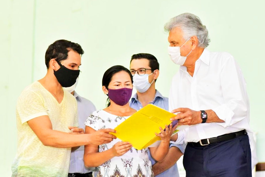 O governador Ronaldo Caiado entregou escrituras a 35 moradores em solenidade na manhã desta 6ª feira (23).