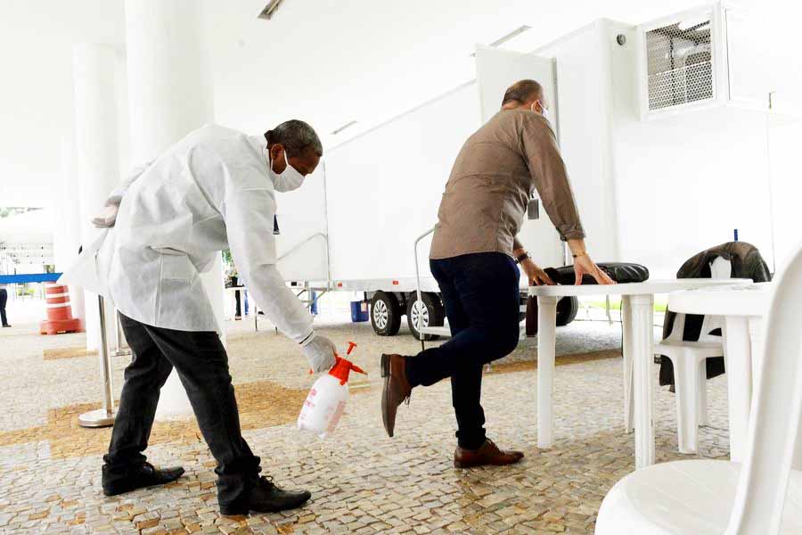 Também passou a ser obrigatória a higienização profilática de mãos, com álcool gel, e calçados, por meio de um borrifador.