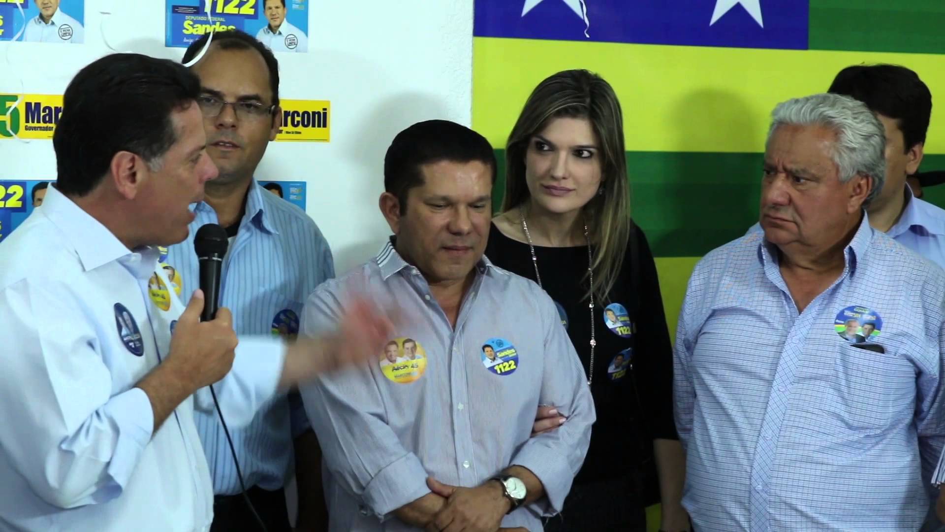 Marconi Perillo pede votos para Sandes Júnior em palanque eleitoral. Ainda na foto, o ex-deputado Vilmar Rocha, escolhido como primeiro suplente de Perillo apesar de ter dito que não pedirá votos para o governador José Eliton em 2018 | Foto: Reprodução