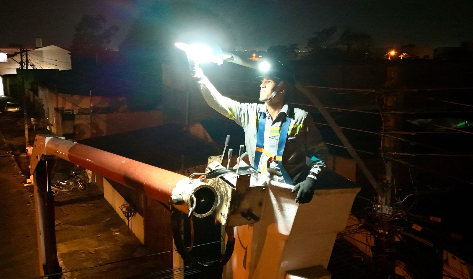 O trabalho começou pelo setor Colina Azul, com a reposição de lâmpadas queimadas para garantir a iluminação das ruas.